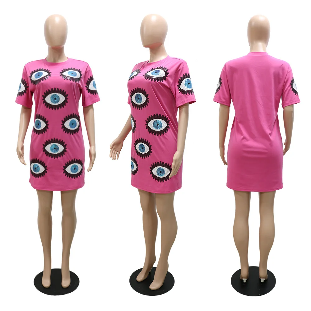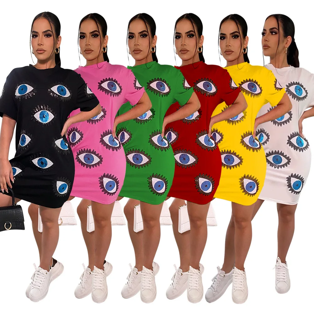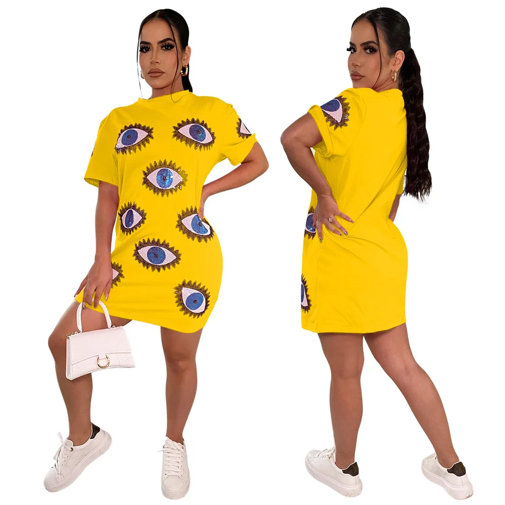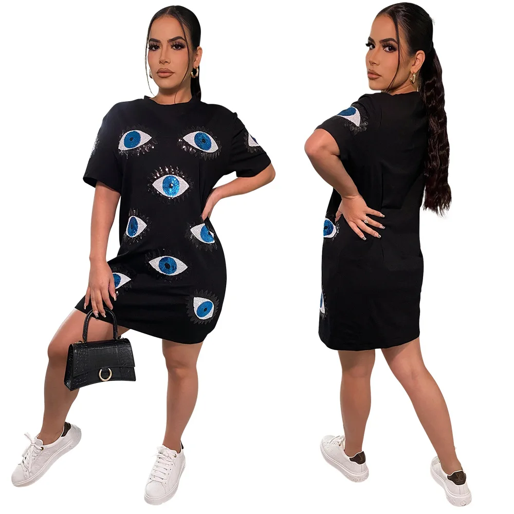 Casual Slim Mini Tee Shirt Sequin Eyes Print Mini Sexy Dress T Shirt Dress