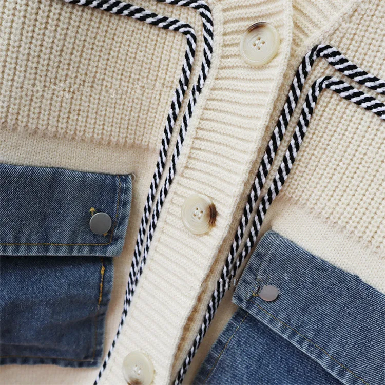 Denim Pocket Stitched Coat Fashion V-Neck Loose Cardigan Sweater