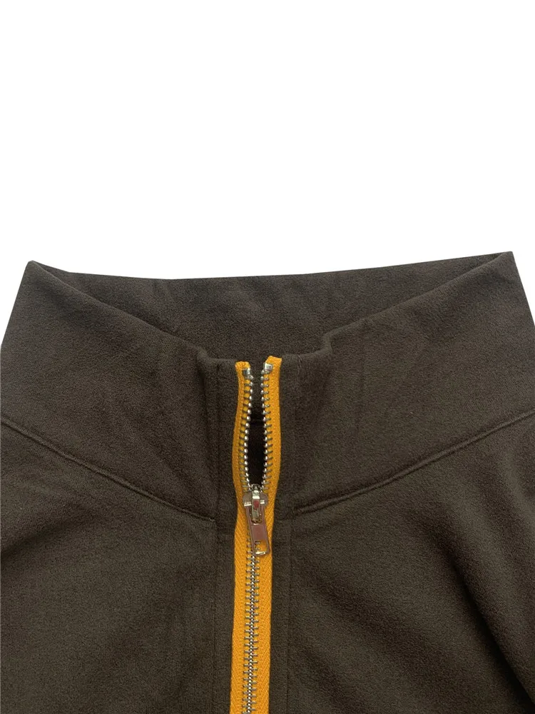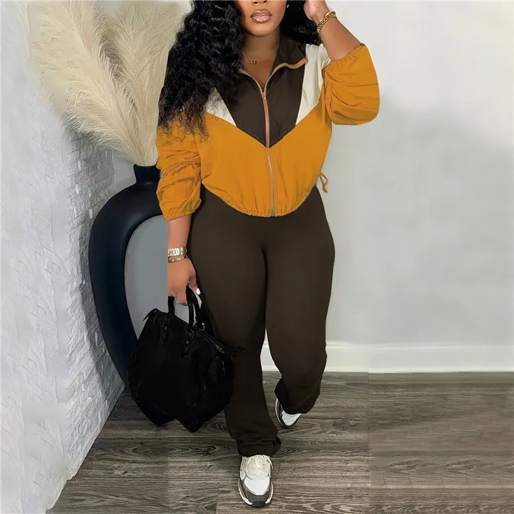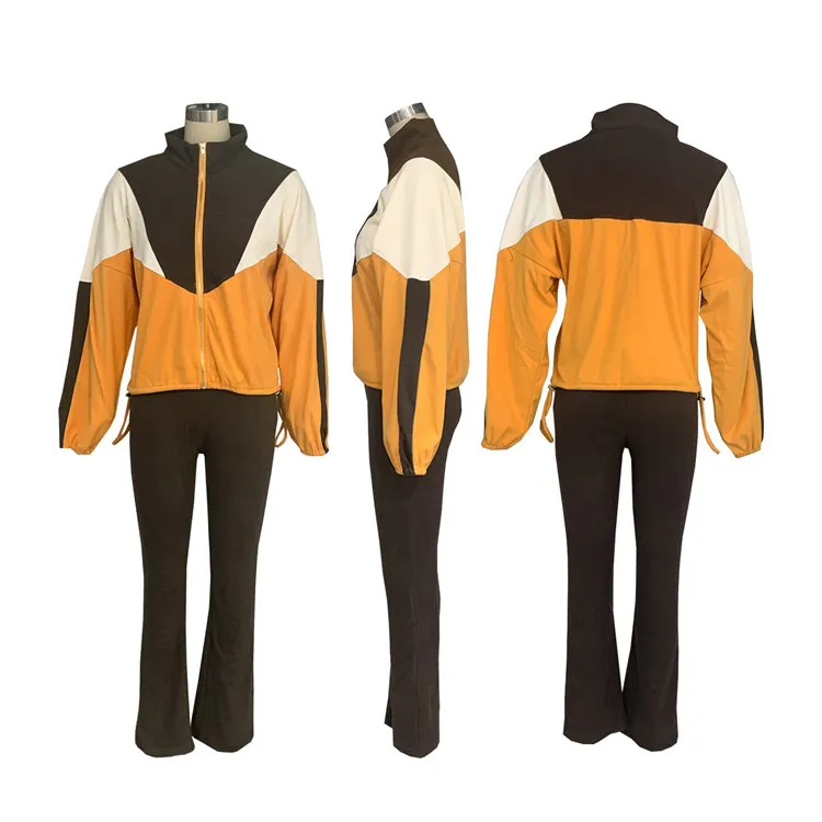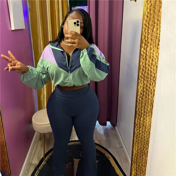 Fashion Patchwork Two-Piece Zipper Crop Top and Skinny Flare Pants Set