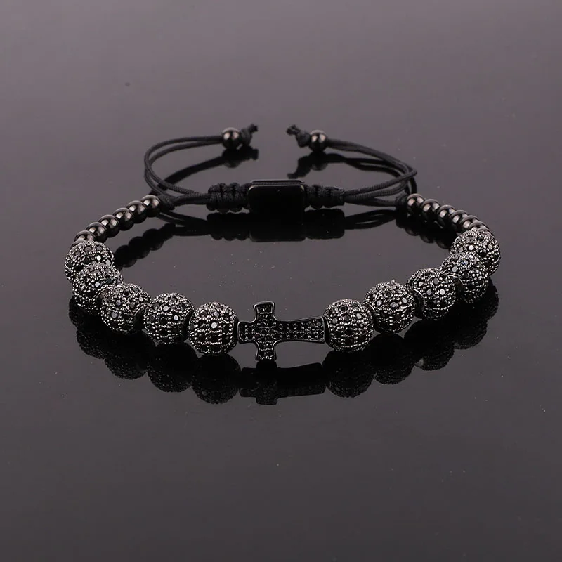 High Quality Micro CZ Pave Cross Charm Stainless Steel Beads Engrave Luxury Bracelet